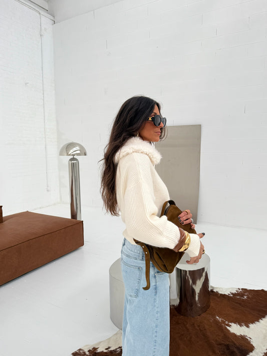 -10%Knit Cardigan with Curly Fur Collar in Brown