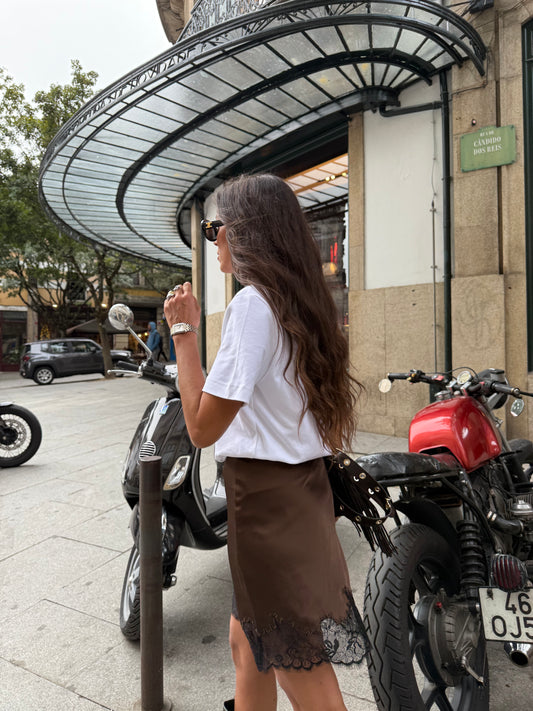 Polka Dot Satin Skirt with Lace Detail in Dark Brown