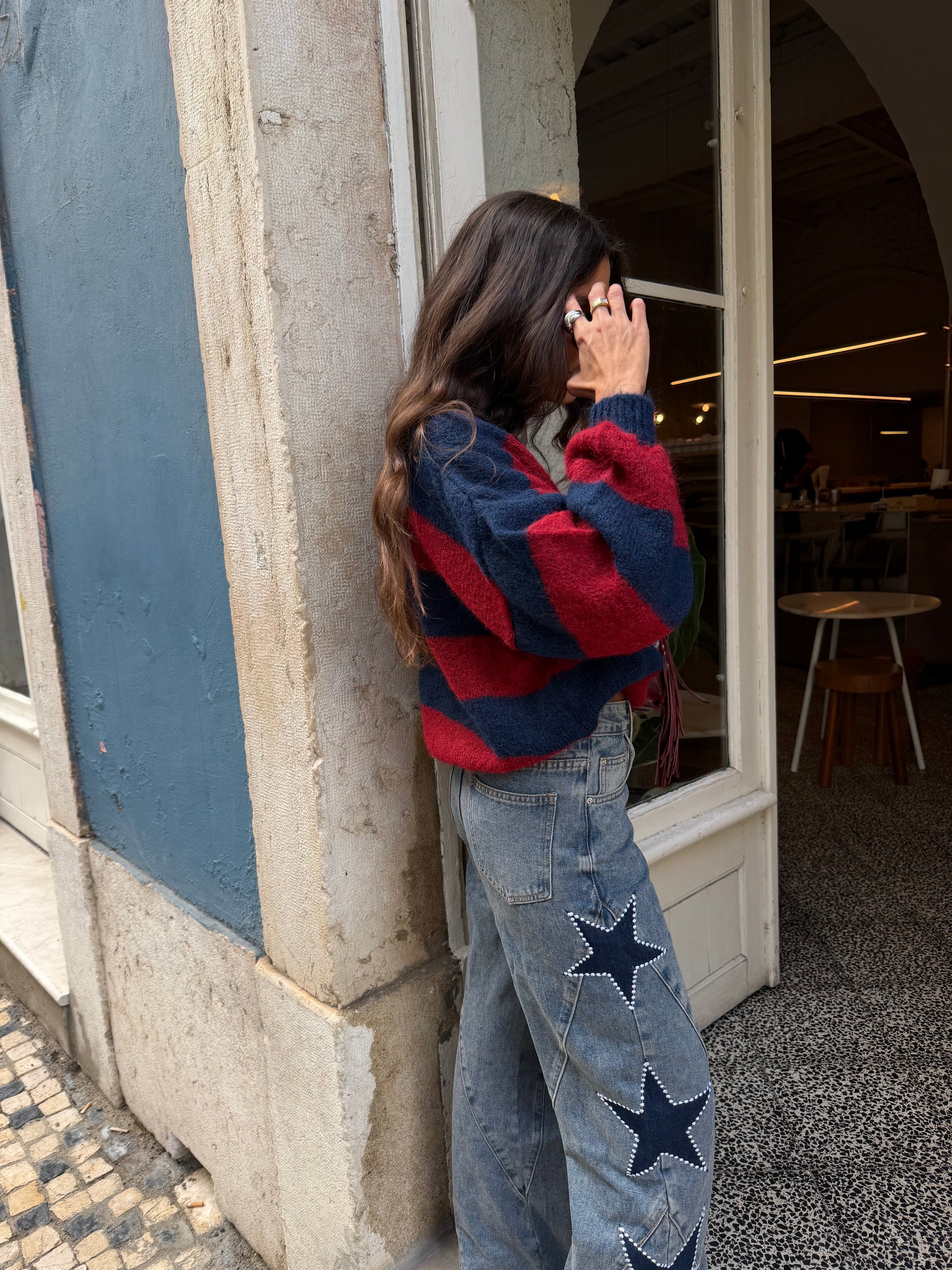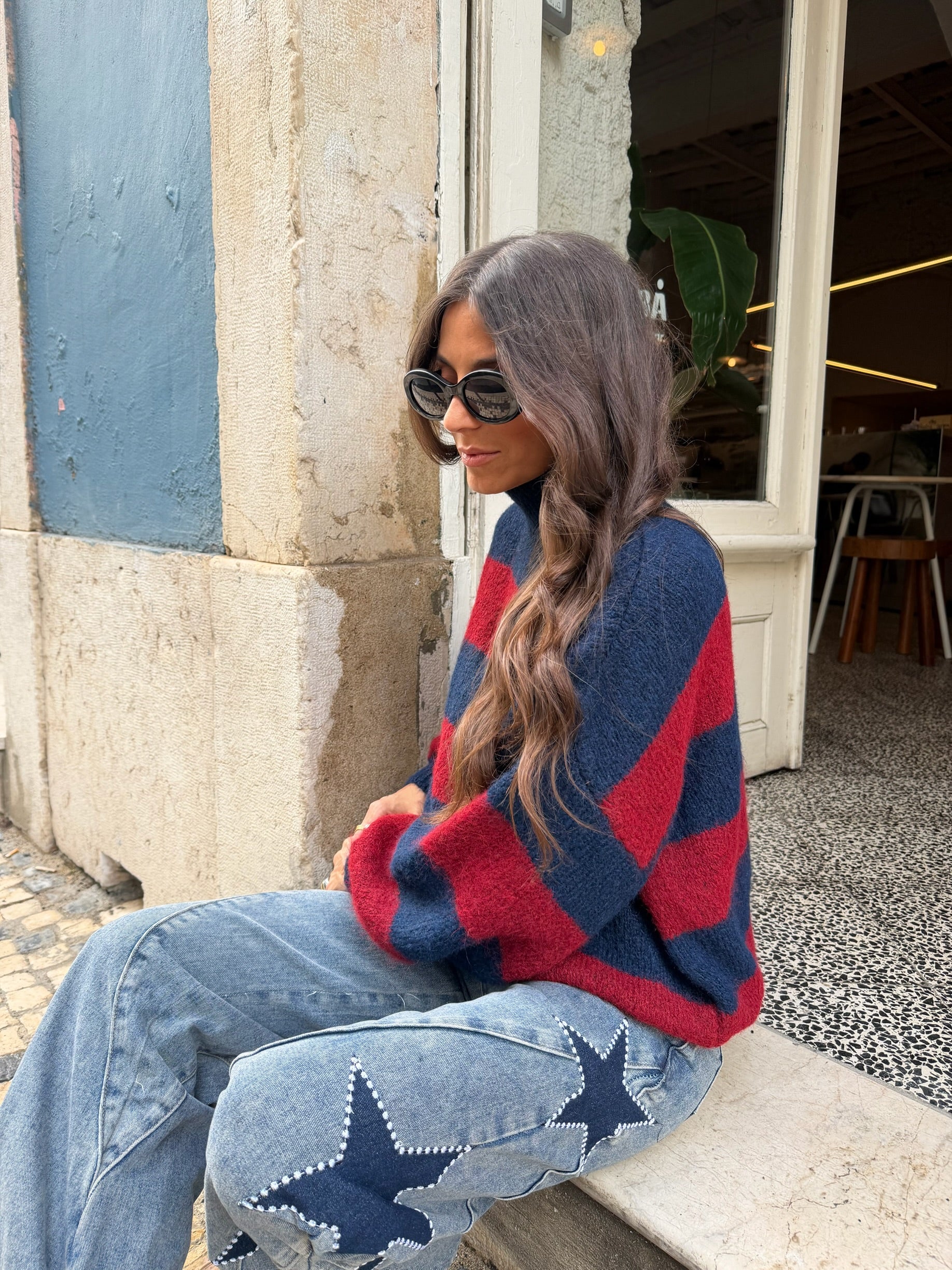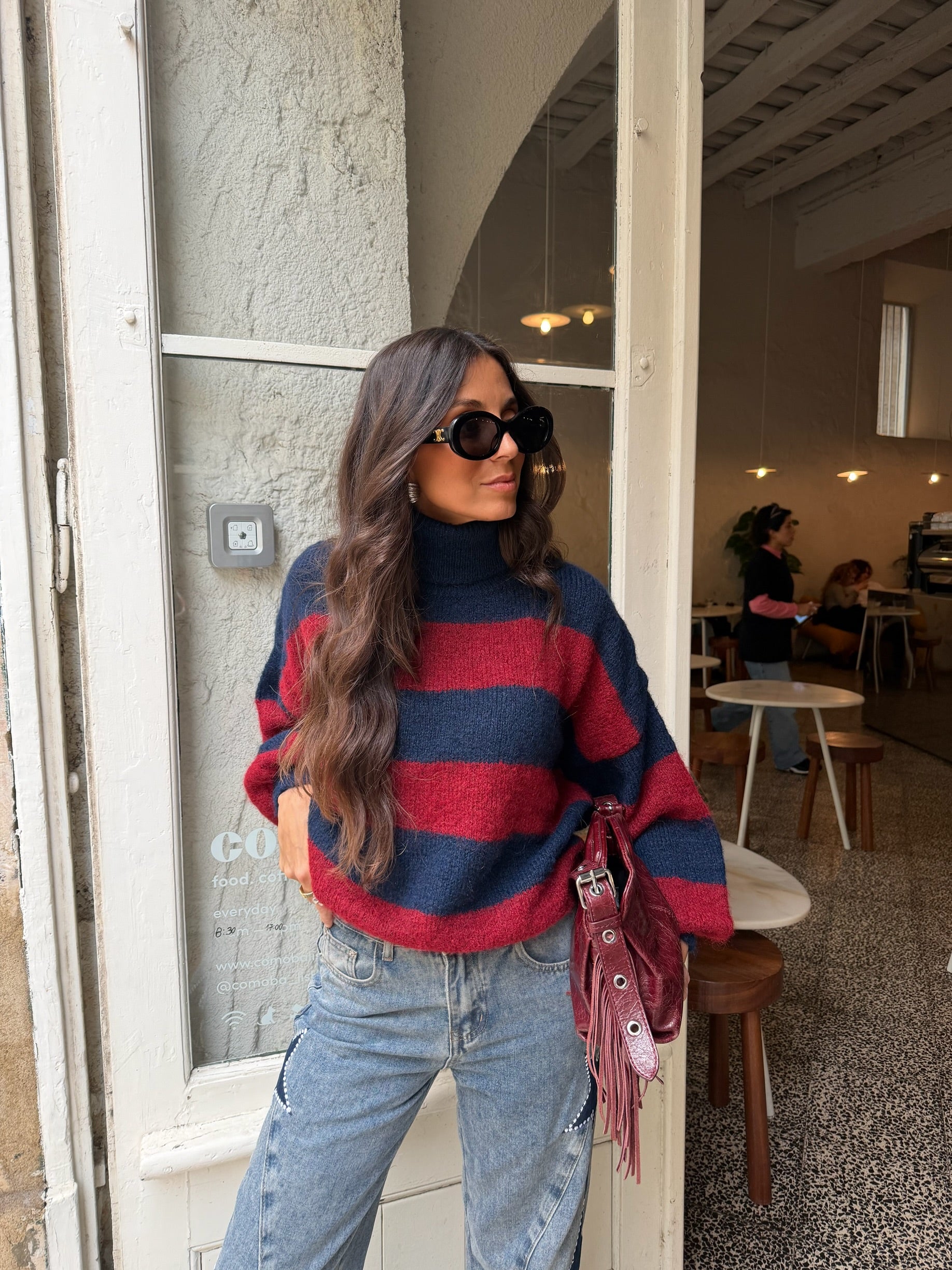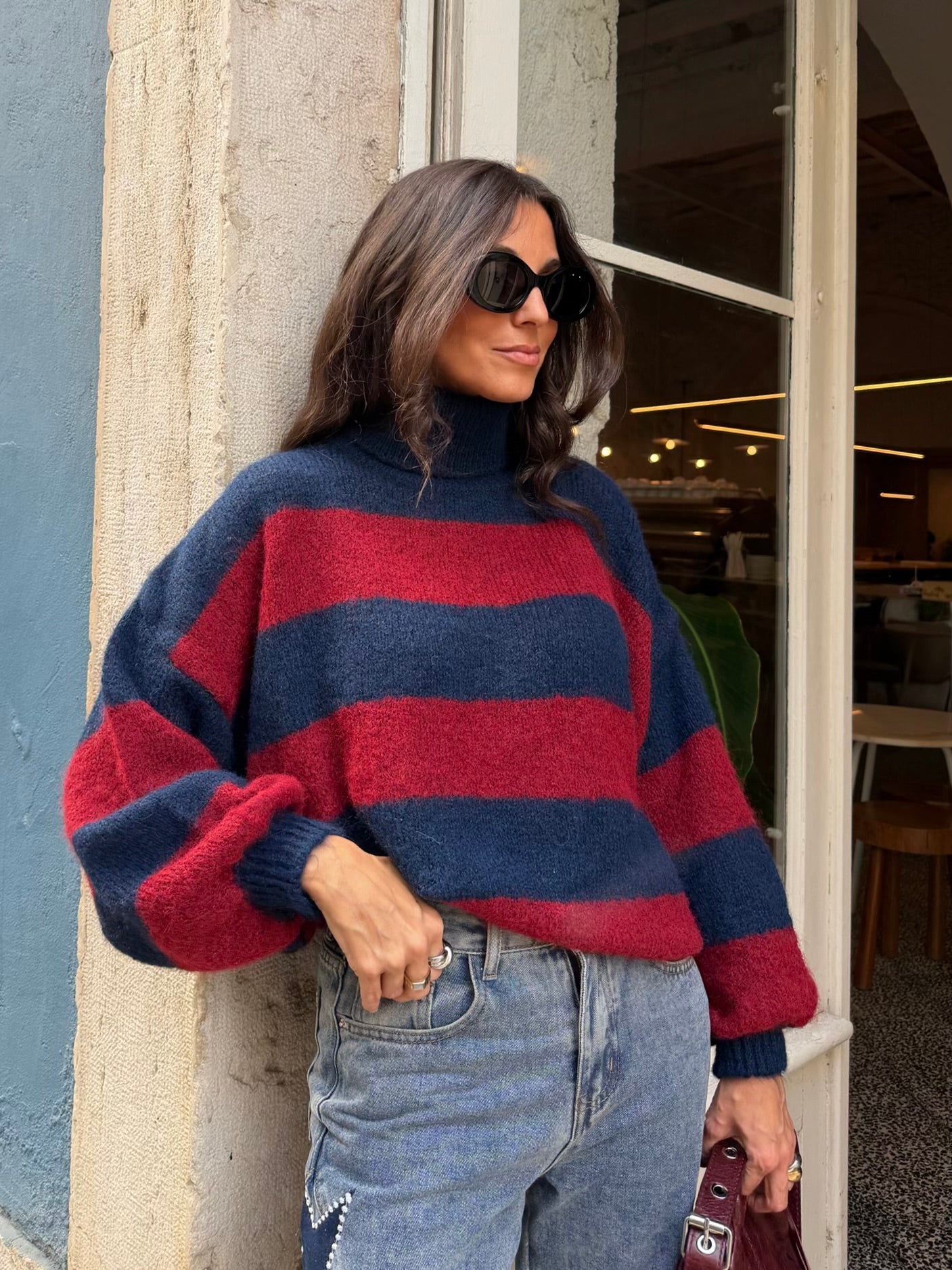 Suéter Ami de cuello alto en azul marino y burdeos